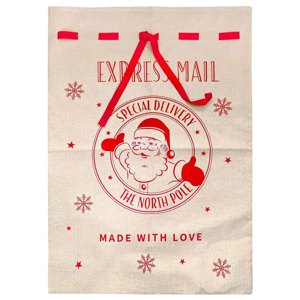 Joulupukki Lahjasäkki Juutista sisältää juutista valmistetun joululahjasäkin, jota koristavat joulupukki, lumihiutaleet ja tähdet sekä punaiset joulutekstit. Säkillä on punainen nauha, jolla aukko kiristetään kiinni.