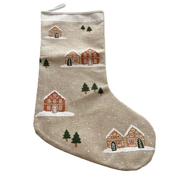 Joulusukka Kuuset/Talot on beige juuttikankaasta valmistettu joulusukka, jossa on valkoinen yläreuna ja koristeena kuusia ja taloja. Joulusukassa on valkoinen lenkki ripustamista varten.