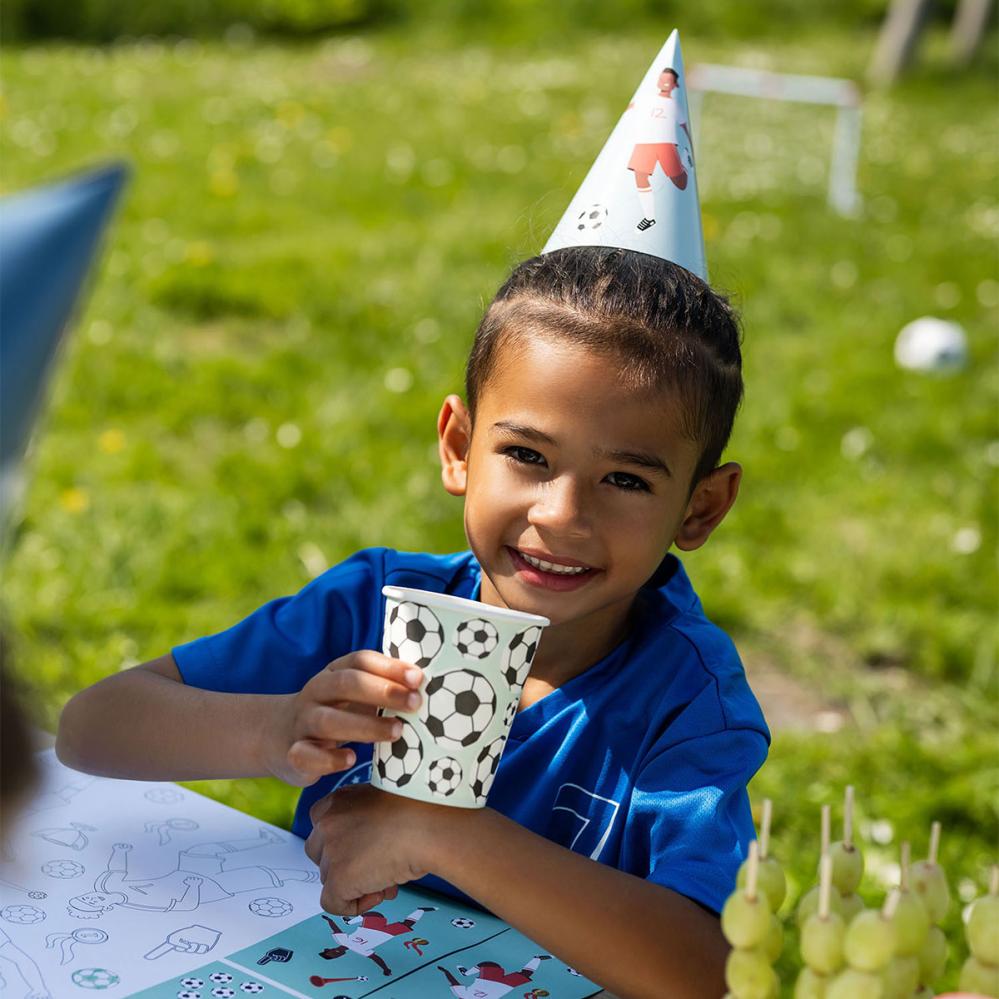 Tee juhlista täydelliset näillä jalkapalloaiheisilla juhlahatuilla. Tämä 6 kappaleen pakkaus sisältää kaksi siistiä kuosia, jotka sopivat täydellisesti jalkapallojuhlien asusteiksi. Helppo tapa piristää kaikenlaisia lastenjuhlia.
