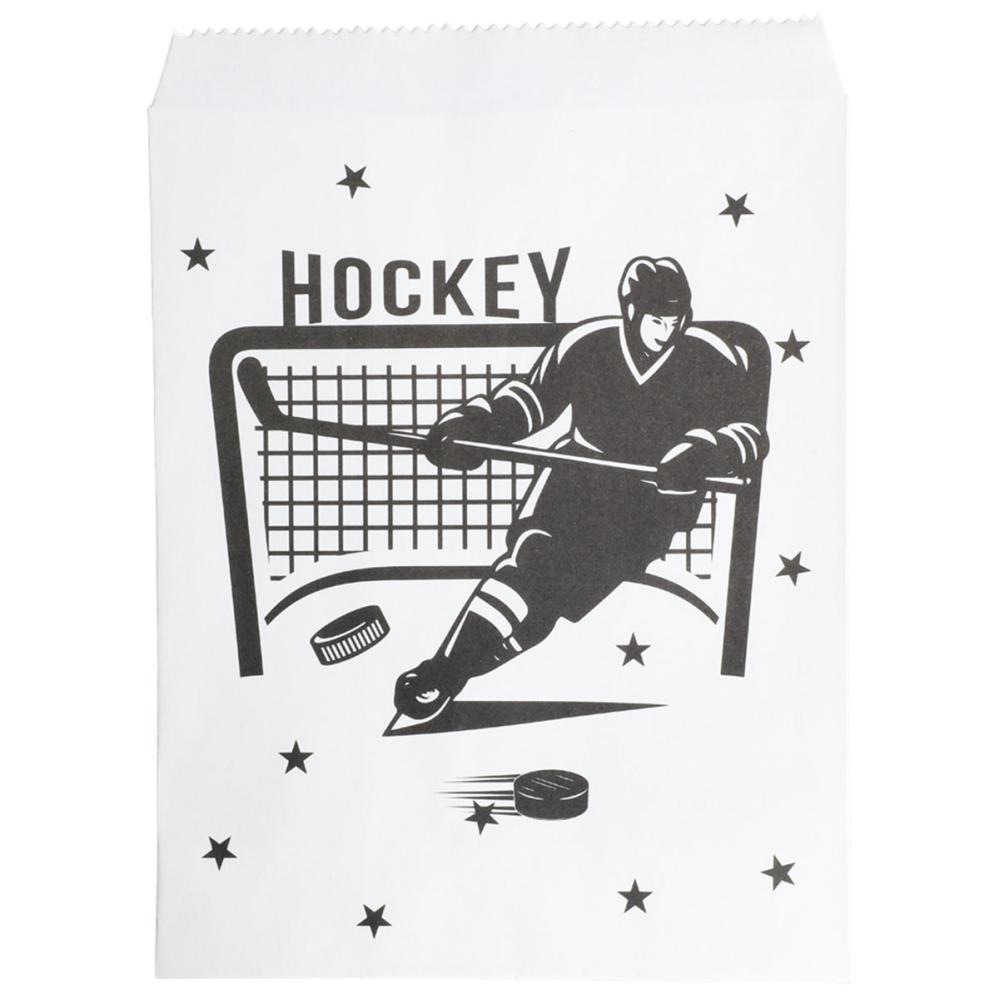 Juhlapussit Hockey 8 kpl sisältää kahdeksan valkoista paperipussia, joiden toisella puolella on musta painatus, jossa on luisteleva jääkiekkoilija, jääkiekkomaali, tähtiä sekä teksti "HOCKEY".