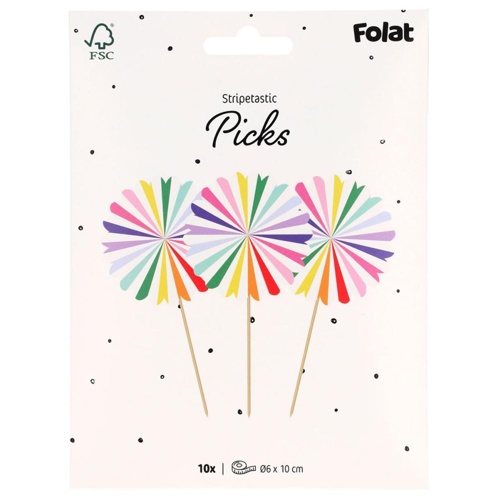 Juhlatikut Stripetastic 10 kpl sisältää kymmenen juhlatikkua, joissa on viuhkan muotoinen kuvio, jonka toisella puolella on värillisiä raitoja.