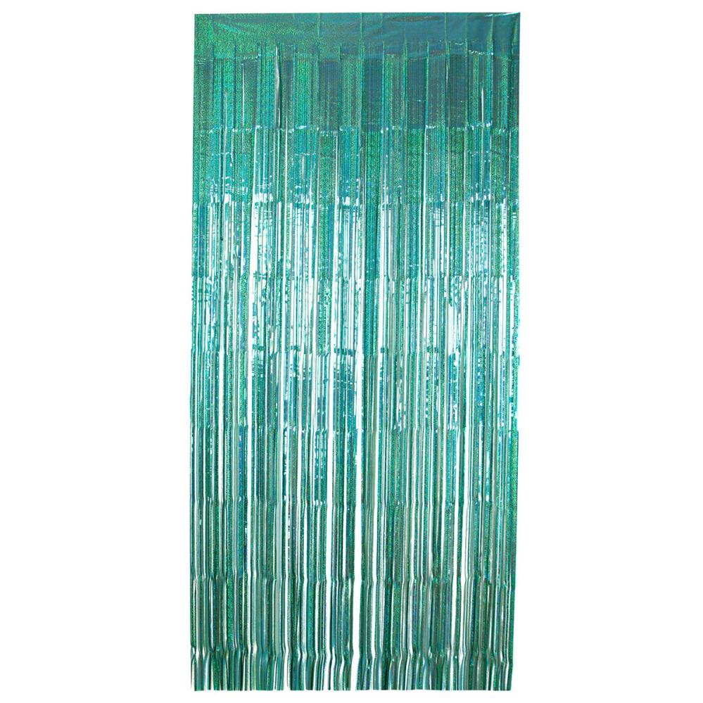 Juhlaverho Hohtava Turkoosi 200x100 cm koostuu juhlavasta oviverhosta, jossa on pitkät ja ohuet turkoosin väriset suikaleet, joissa on pieniä, hohtavia pisteitä, jotka luovat holografisen efektin.