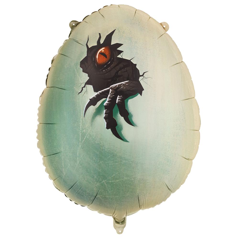 Jurassic World Dinosaurusmuna Folioilmapallo 48 x 64 cm sisältää vaaleanvihreän folioilmapallon dinosauruksen munan muodossa, ja sitä koristaa dinosauruskuva, jossa on oranssinpunainen silmä ja terävät kynnet, ja se näyttää siltä kuin se olisi murtautumassa ulos ”munasta”.