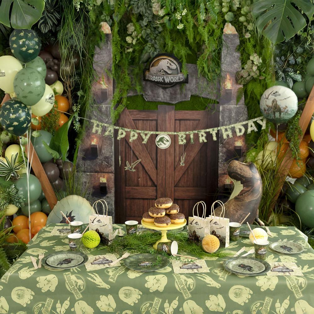 Tämän pöytäliinan avulla dinosaurusteemaiset juhlat saavat hienon koristeen, ja siitä tulee käytännöllinen juhlatarvike lapsille. Jurassic World juhliin sopivana koristeena se on itsestään selvä valinta lasten juhlatarvikkeiden joukossa, kun juhlatunnelman halutaan olevan villi.