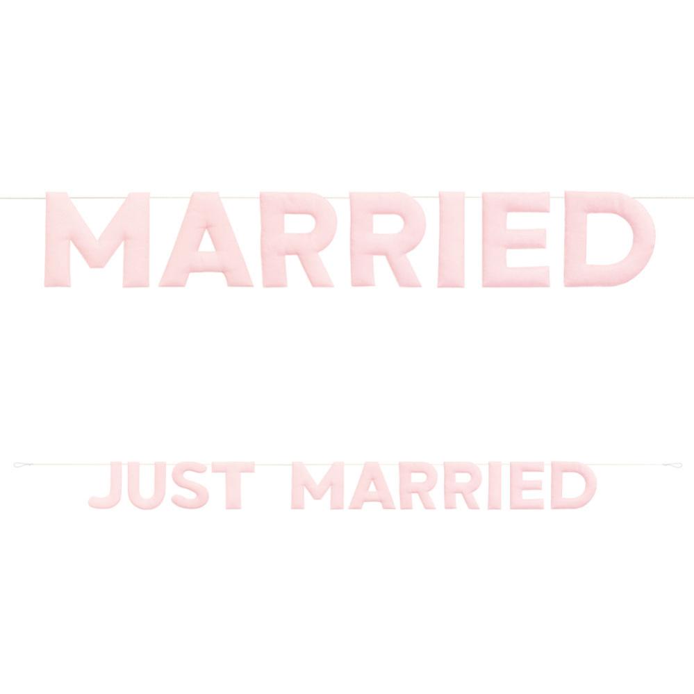 Just Married Viirinauha Kankaasta Pinkki sisältää viirinauhan, jossa on yksitoista pastellinvaaleanpunaista kangaskirjainta, jotka yhdessä muodostavat tekstin "JUST MARRIED". Mukana tulee valkoinen naru helppoa ripustamista varten.