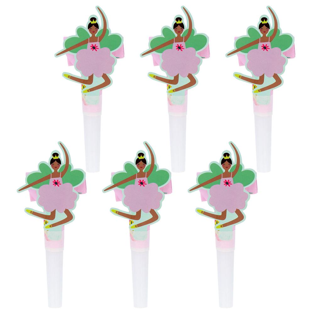 Käärmepillit Fabulous Fairy 6 kpl sisältää kuusi vaaleanpunaista juhlapilliä, joissa on värikkäitä kukkakuvioita ja pahvinen hahmo, joka on kiinnitetty pillin päälle tanssivan balerina-asuisen keijun muodossa. Puhalla pilleihin, jotta ne ujeltavat kovaa ja rullautuvat auki.