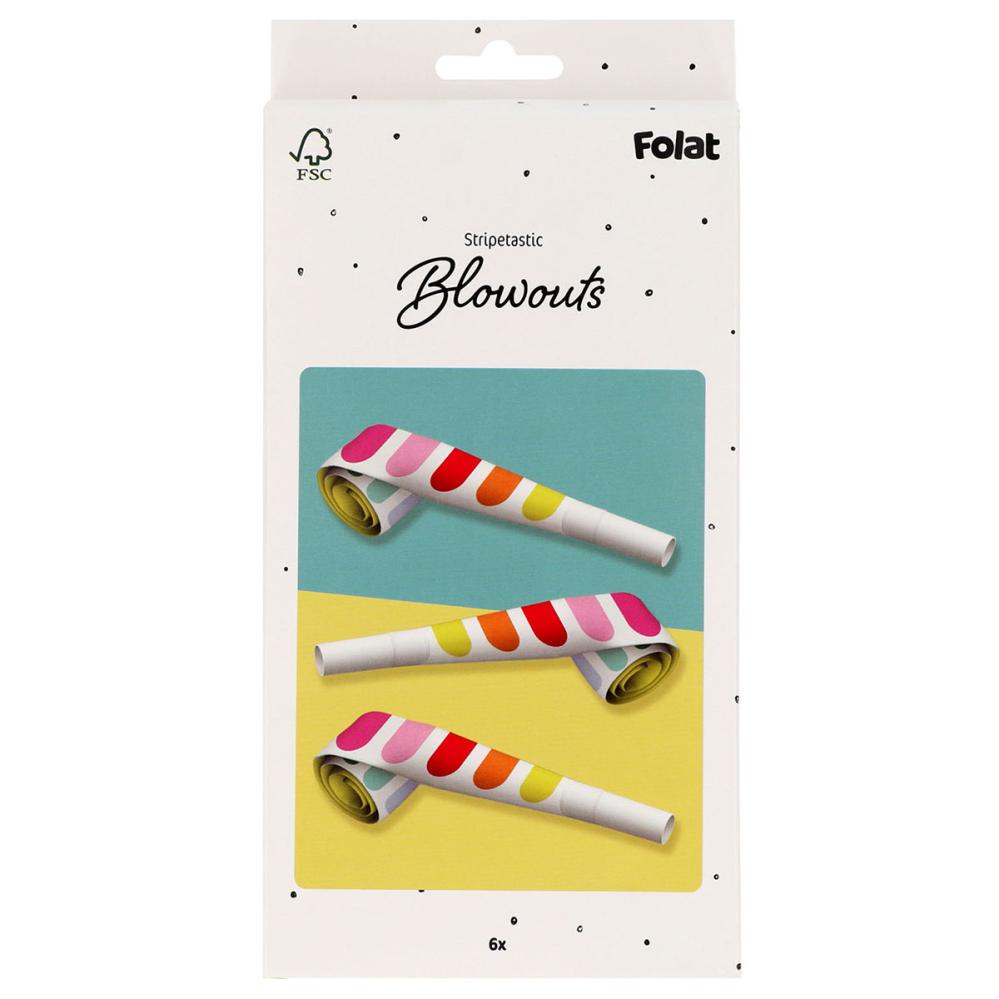 Käärmepillit Stripetastic 6 kpl sisältää kuusi valkoista käärmepilliä, jotka on koristeltu erivärisillä raidoilla. Puhalla pilliin, jotta se ujeltaa kovaa ja rullautuu auki.
