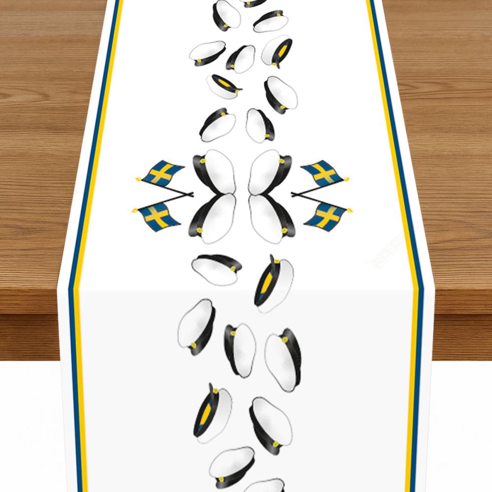 Kaitaliina Studenten sisältää valkoisen kaitaliinan, jossa on painatuksena ylioppilaslakkeja, Ruotsin lippuja sekä sinisiä ja keltaisia raitoja reunoja pitkin.