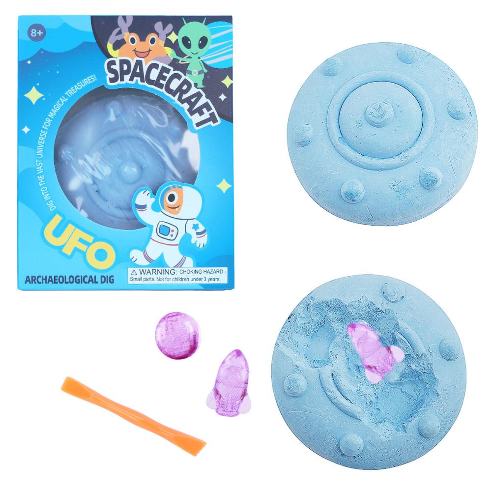 Kaivaussetti UFO sisältää yllätyspakkauksen, jossa on lentävä lautanen, joka voidaan kaivaa esiin mukana tulevalla kaivutyökalulla kahden satunnaisen jalokiven löytämiseksi. Ohjeet ovat pakkauksessa.