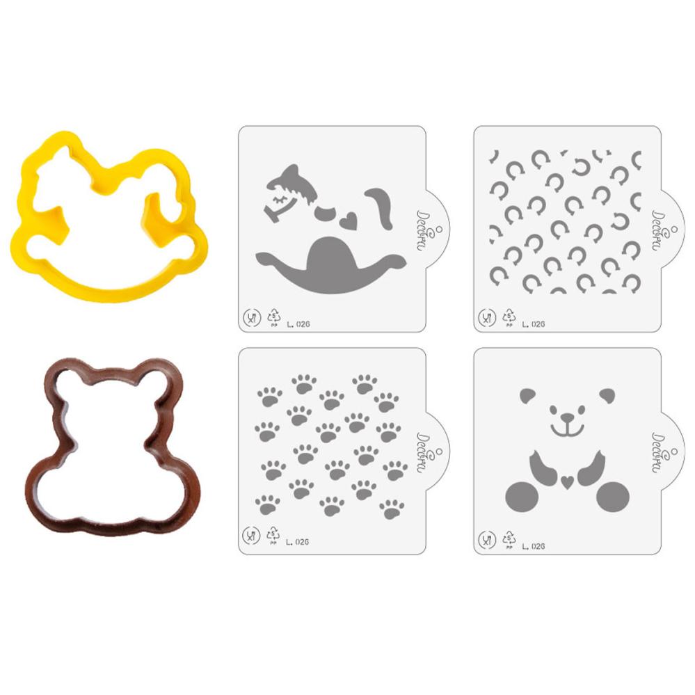 Karhu/Keinuhevonen Keksimuotit/Leivontamallit 6-kpl sisältää leivontasetin, jossa on kaksi keksimuottia, karhun ja keinuhevosen muodossa, sekä neljä leivontamallia, joissa on vastaava muoto ja niiden jalanjäljet.