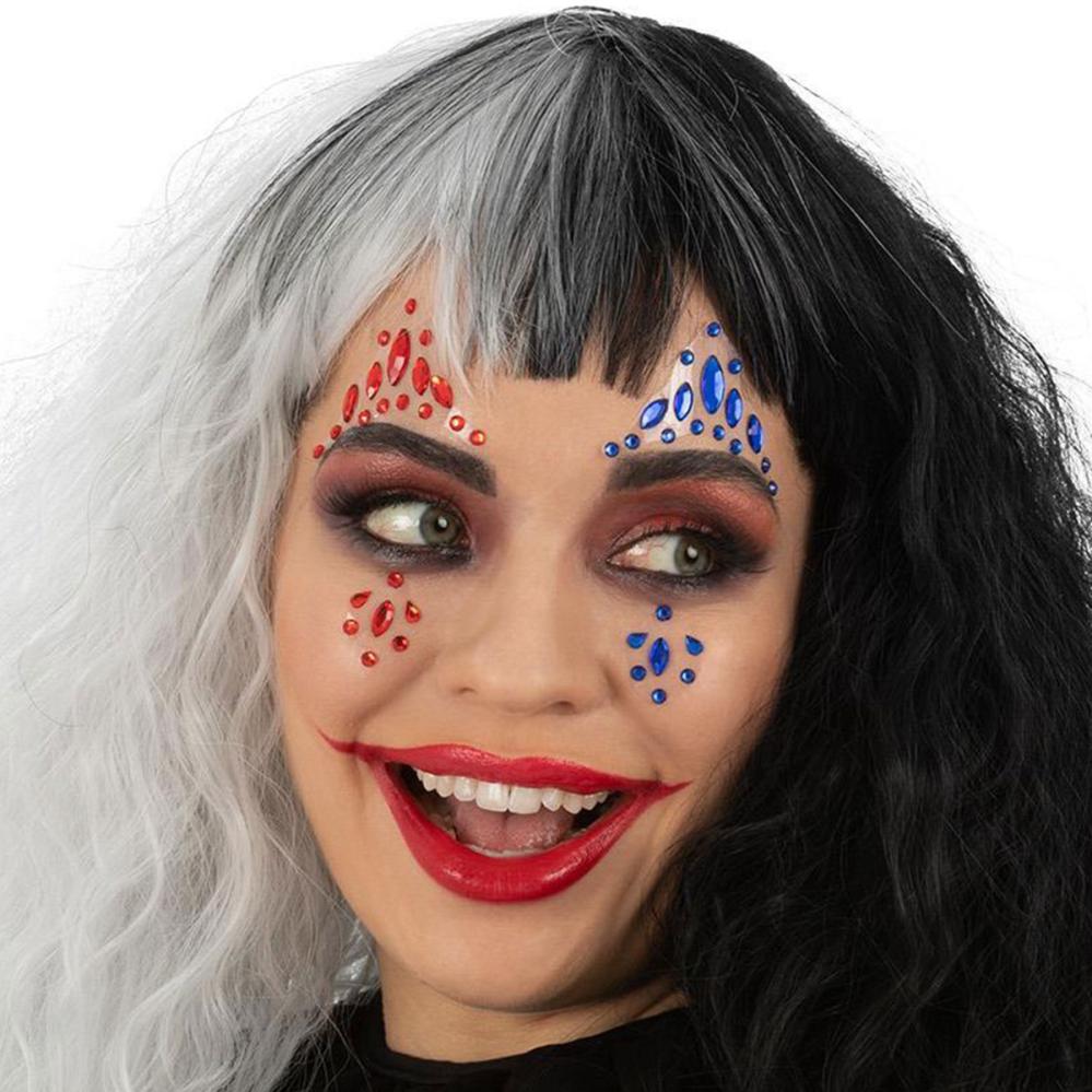 Muuta ilmettäsi näillä värikkäillä kasvokoruilla. Neljä itsetarrautuvaa kasvokorua, joissa on punaisia ja sinisiä strasseja, saa jokaisen asun juhlakuntoon. Nämä ovat täydelliset kasvokorut festareille, naamiaisiin tai luovaan meikkiin.