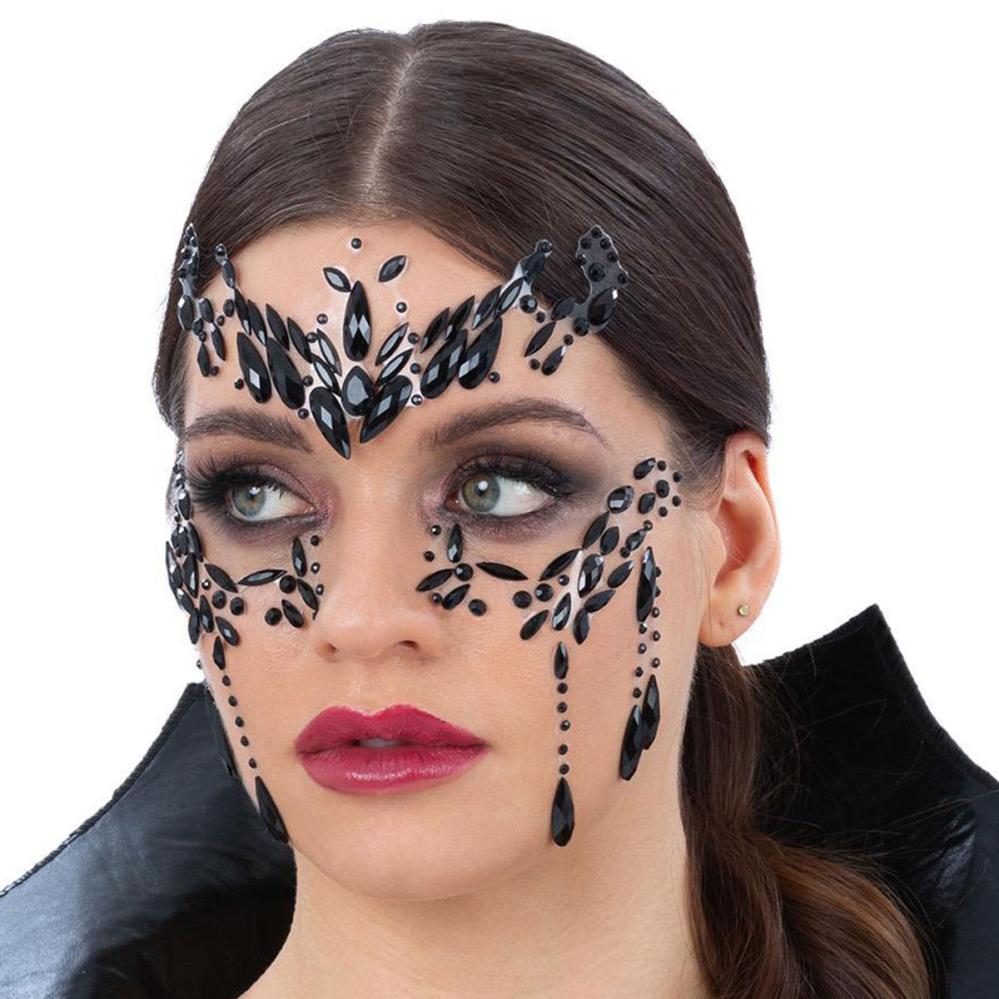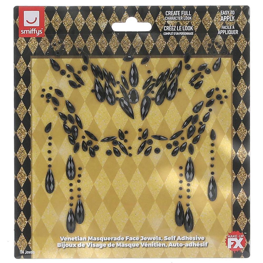Kasvokorut Venetsialainen Naamiaiset koostuvat kahdeksasta itseliimautuvasta kasvokorusta, joissa on erikokoisia mustia timantteja. Timantit ovat läpinäkyvissä tarroissa, joissa on itseliimautuva tausta. Kiinnitä ne irrottamalla jokainen tarra varovasti muovista ja painamalla ne puhtaalle ja kuivalle iholle.