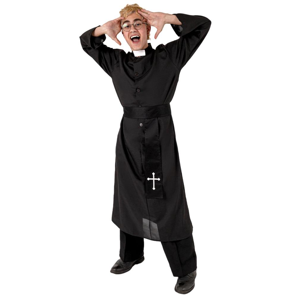 Katolisen Papin Asu sisältää pitkän, mustan papinasun, jossa on napit edessä, sekä papinkauluksen. Mukana tulee myös musta vyö, johon on kiinnitetty valkoisella ristillä varustettu sash-nauha.