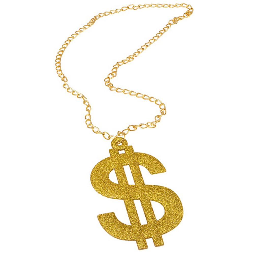 Kaulakoru Kimaltelevalla Dollarimerkillä Kulta on kullanvärinen kaulakoru, jossa on suuri kimalteleva dollarimerkki.