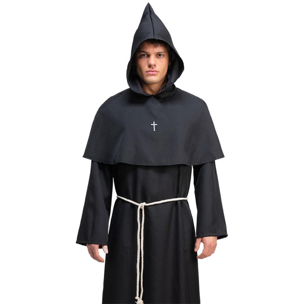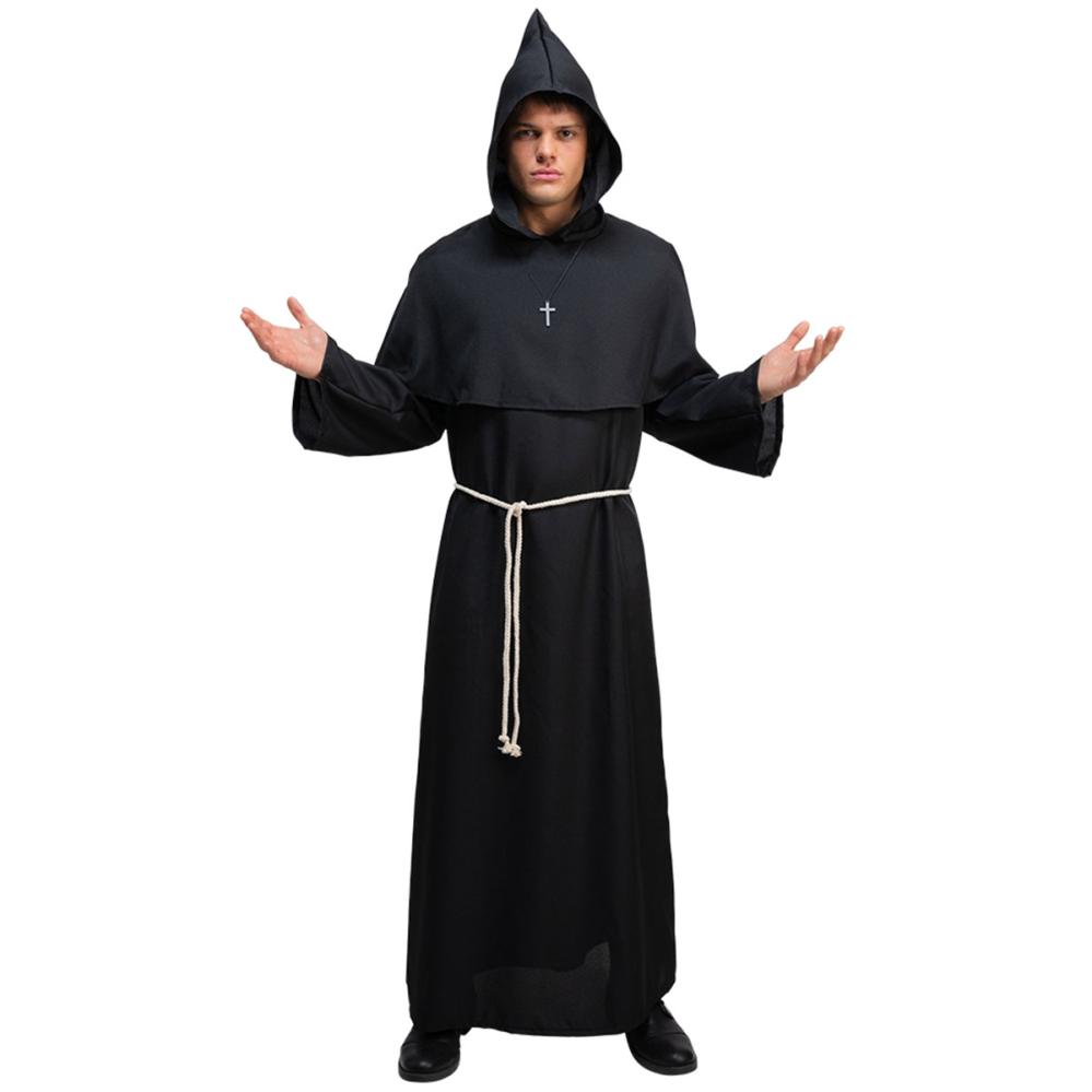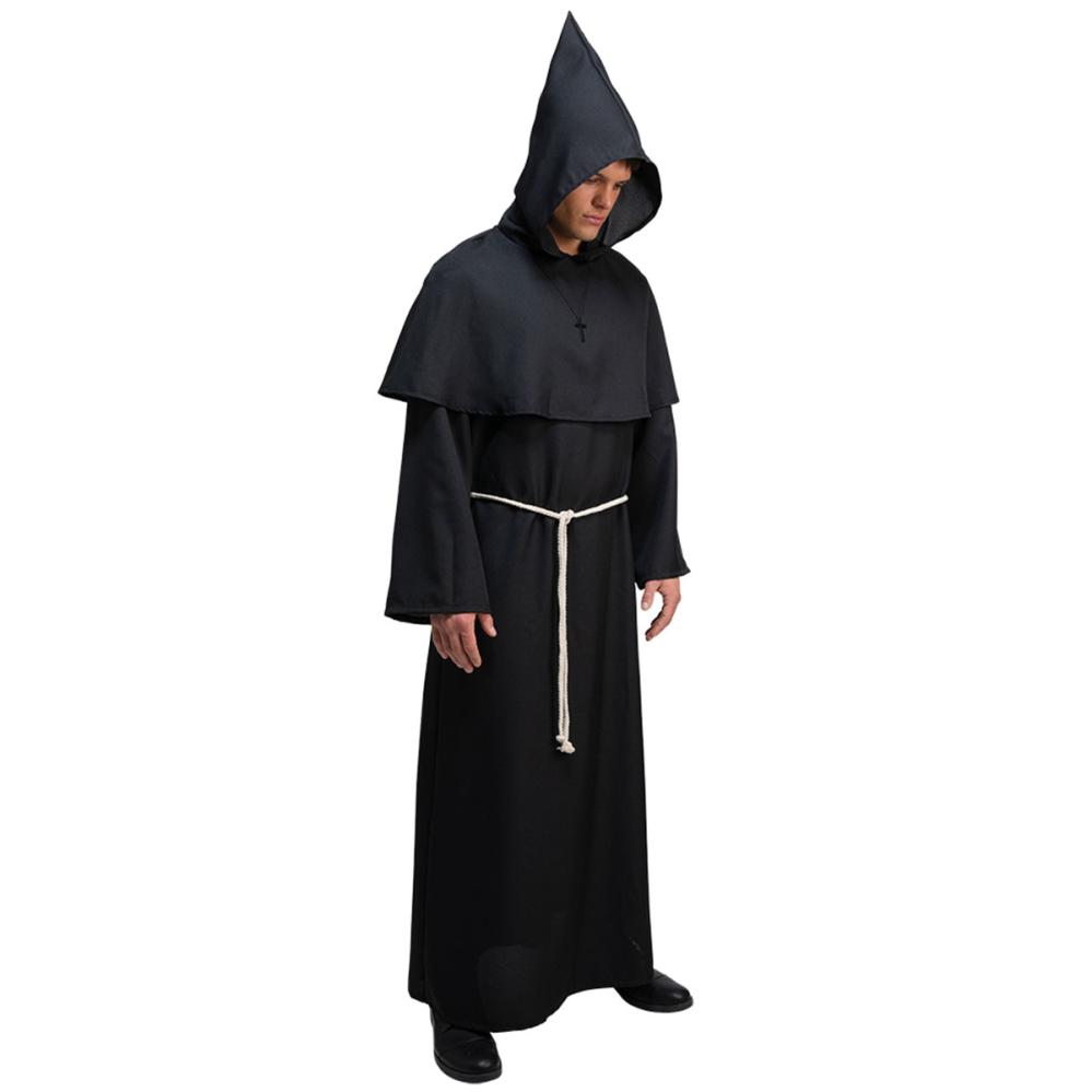 Astu historiaan tämän aidon keskiaikaisen munkkiasun avulla. Pitkä musta munkinkaapu hupulla, valkoinen köysi ja ristikaulakoru tekevät munkkinaamiaisasustasi täydellisen. Täydellinen munkkinaamiaisasuksi teemajuhliin.