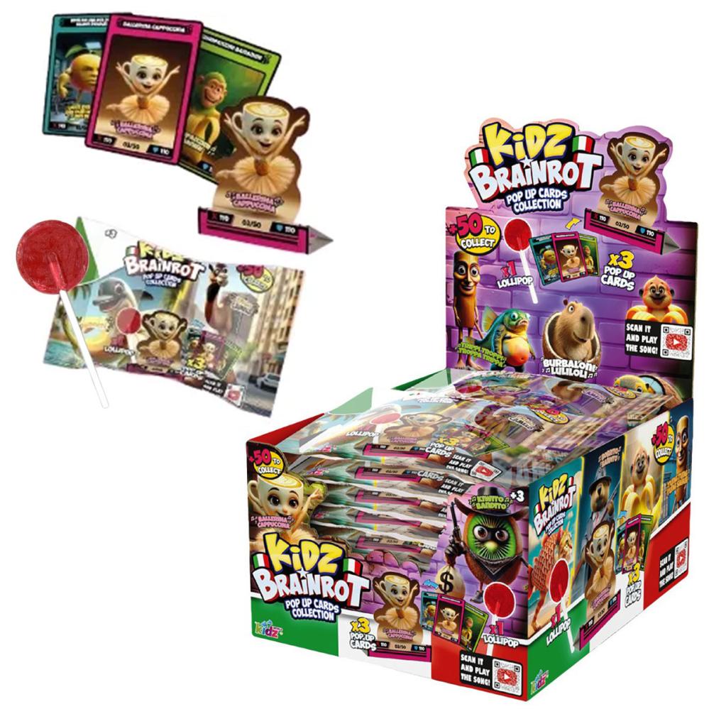 Kidz Brainrot Keräilykortit ja Tikkari on pakkaus, joka sisältää herkullisen hedelmämakuisen tikkarin sekä kolme holografista keräilykorttia, joissa on italialaisen Brainrotin värikkäitä ja kimaltelevia kuvioita. Kerättävänä on yli 50 erilaista korttia, ja jokainen pakkaus sisältää satunnaisen sekoituksen. Skannaa QR-koodit katsoaksesi ja kuunnellaksesi videoita.