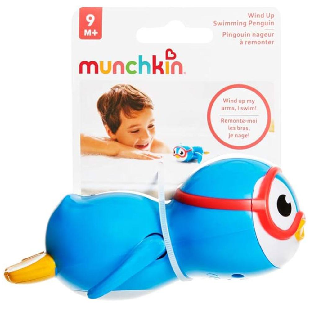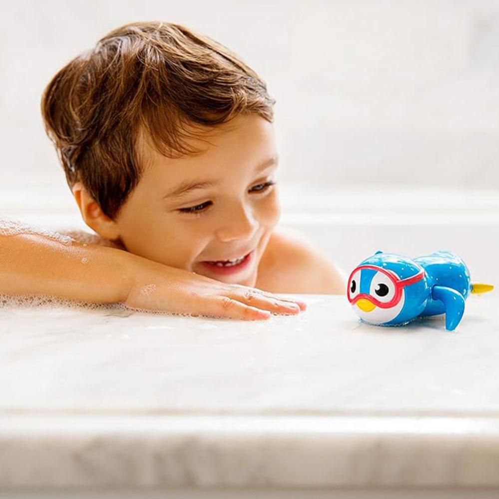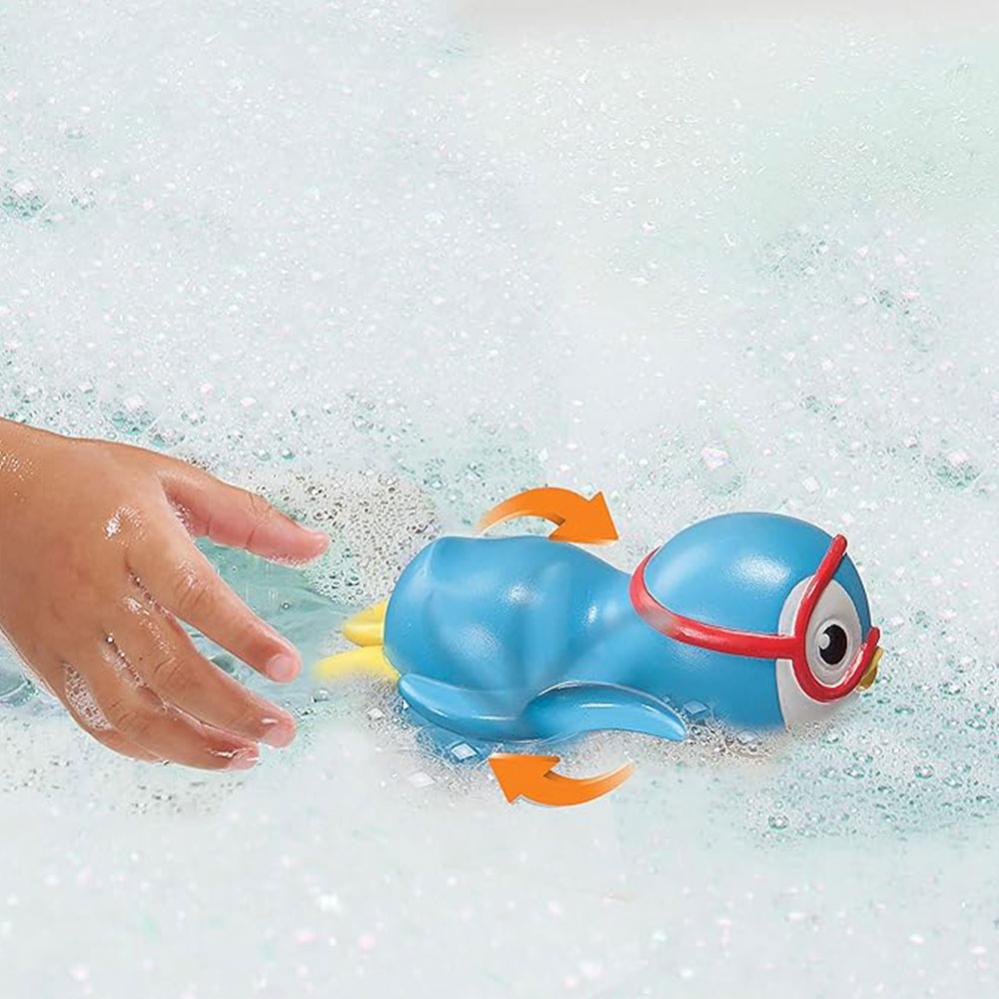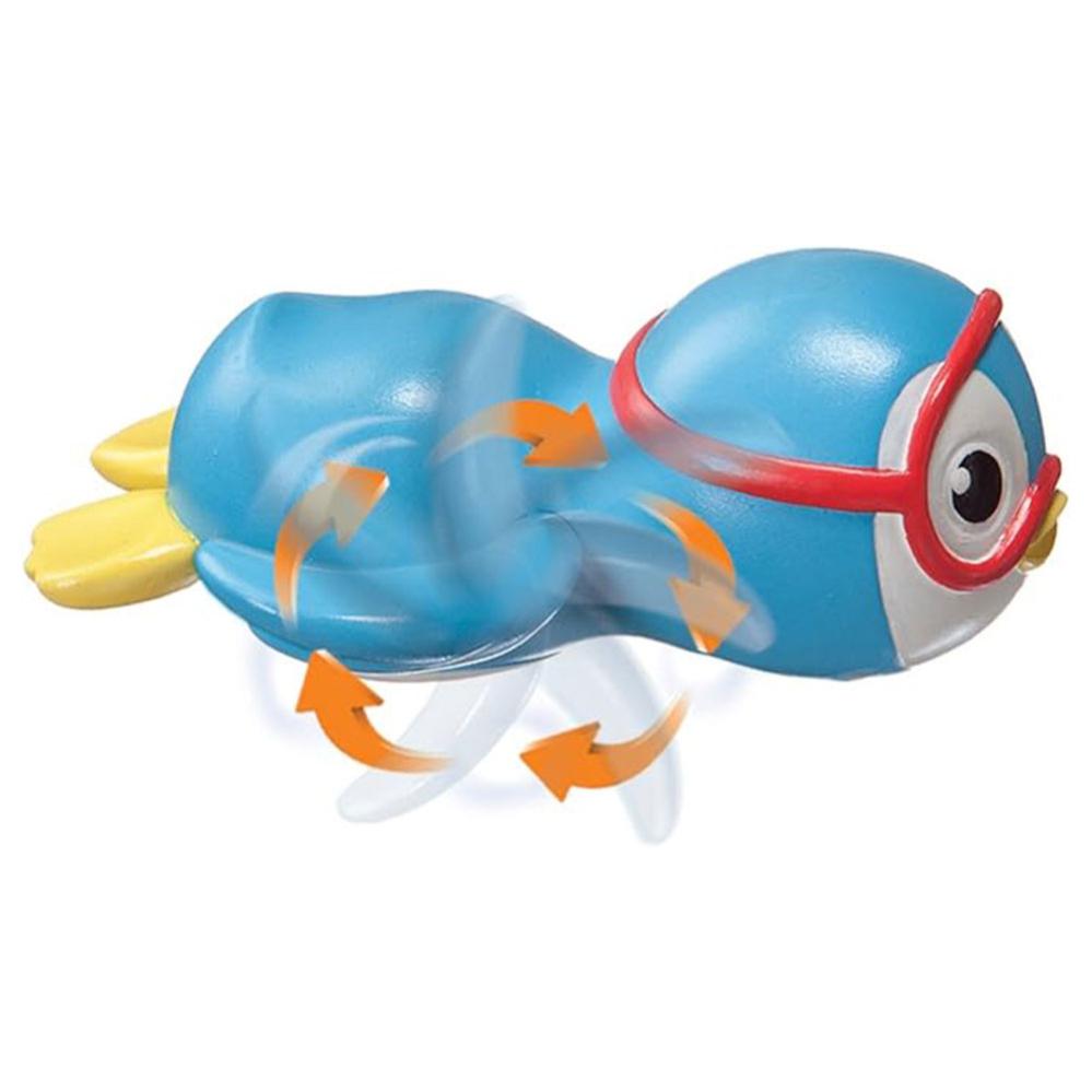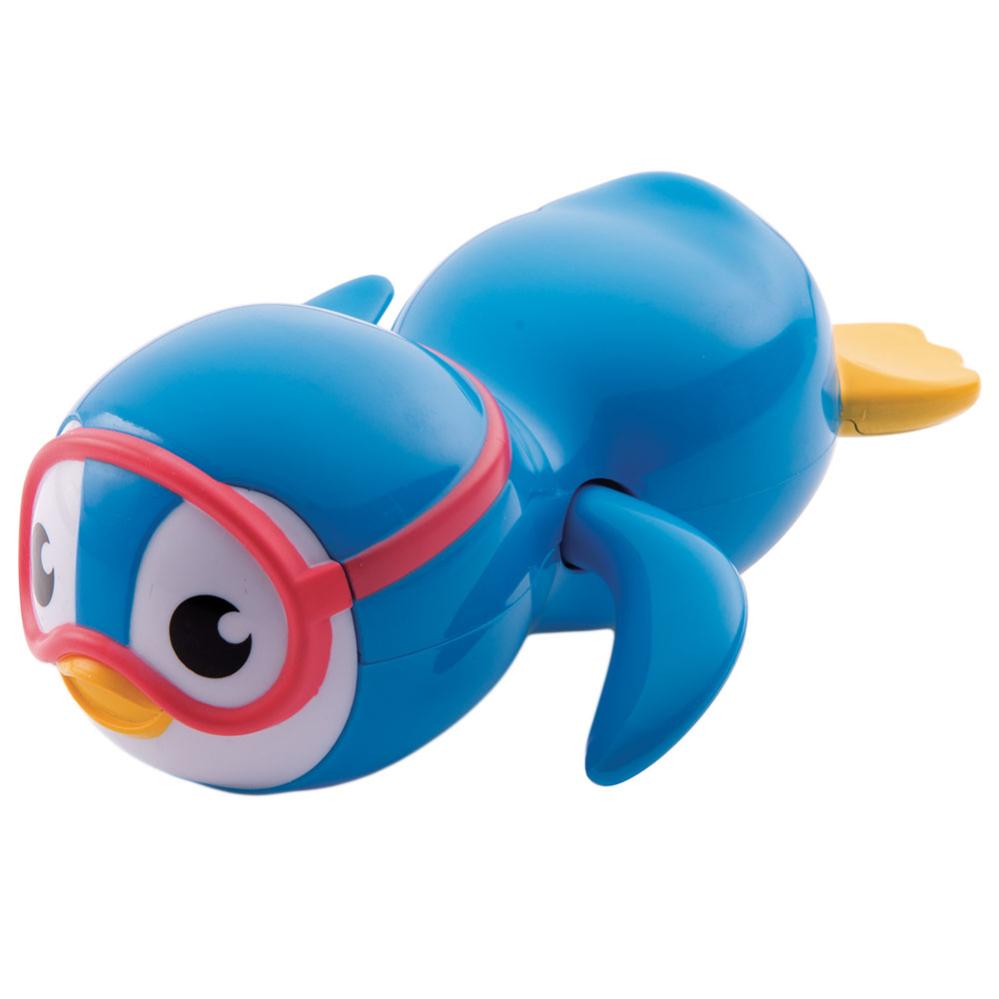 Kierrettävä Kylpylelu Pingviini on sinisen pingviinin muotoinen kylpylelu, joka liikkuu eteenpäin vedessä, kun sen käsiä kierretään.