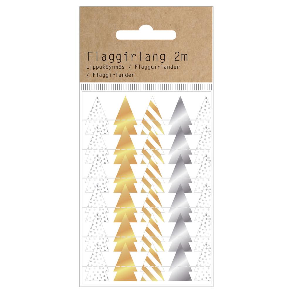 Kimaltava Lahjanauha Joulukuuset 2 m sisältää lahjanauhan, joka on seppeleen muotoinen ja jossa on pieniä kimaltavan kullan ja hopean värisiä joulukuusia valkoisessa langassa.