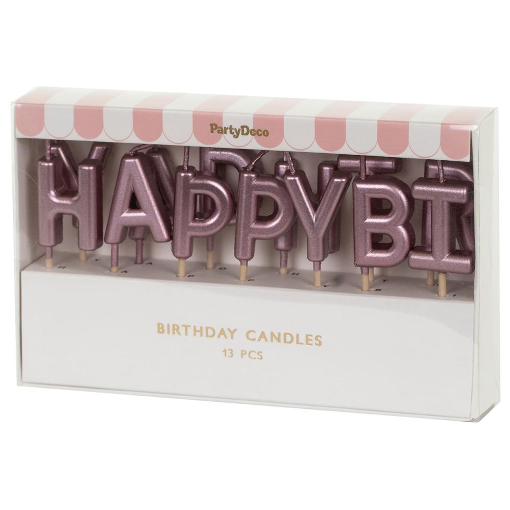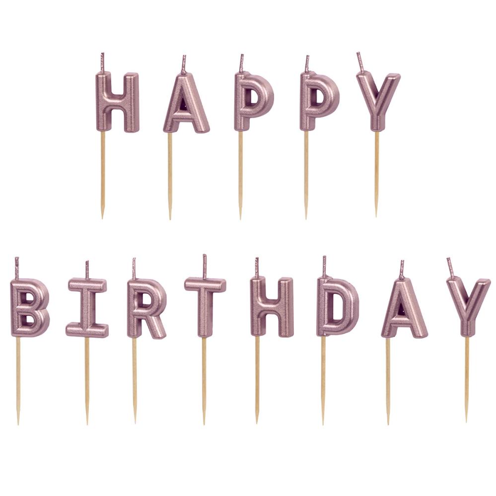 Kirjainkynttilät Happy Birthday Ruusukulta sisältää kolmetoista kirjaimen muotoista kakkukynttilää, jotka muodostavat tekstin "HAPPY BIRTHDAY" ruusukultaisena.