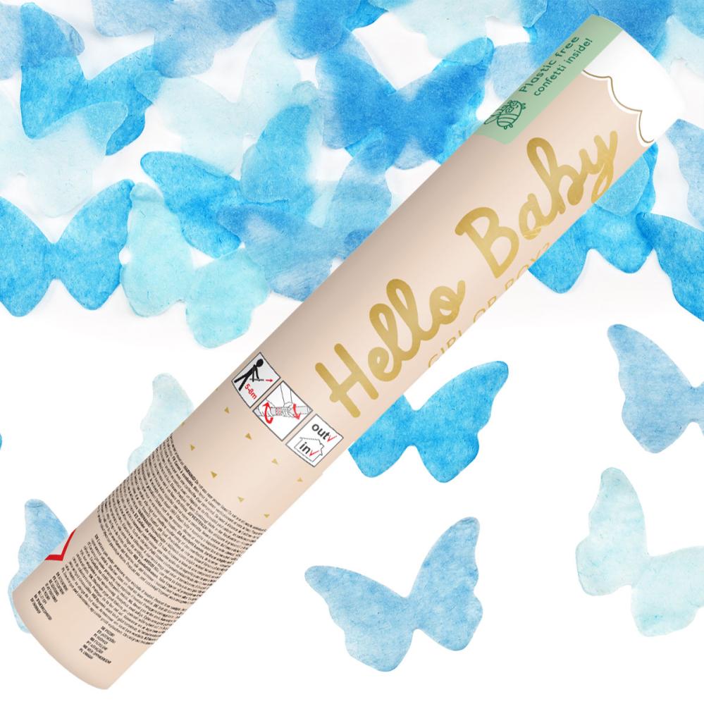 Tällä konfettitykillä konfetti leviää sinisinä perhosina, mikä tekee vauvakutsuistasi tai sukupuolenpaljastusjuhlistasi ikimuistoisia hetkiä. Perhoskonfetti tuo jokaiseen juhlaan leikkisän ja värikkään tunnelman.