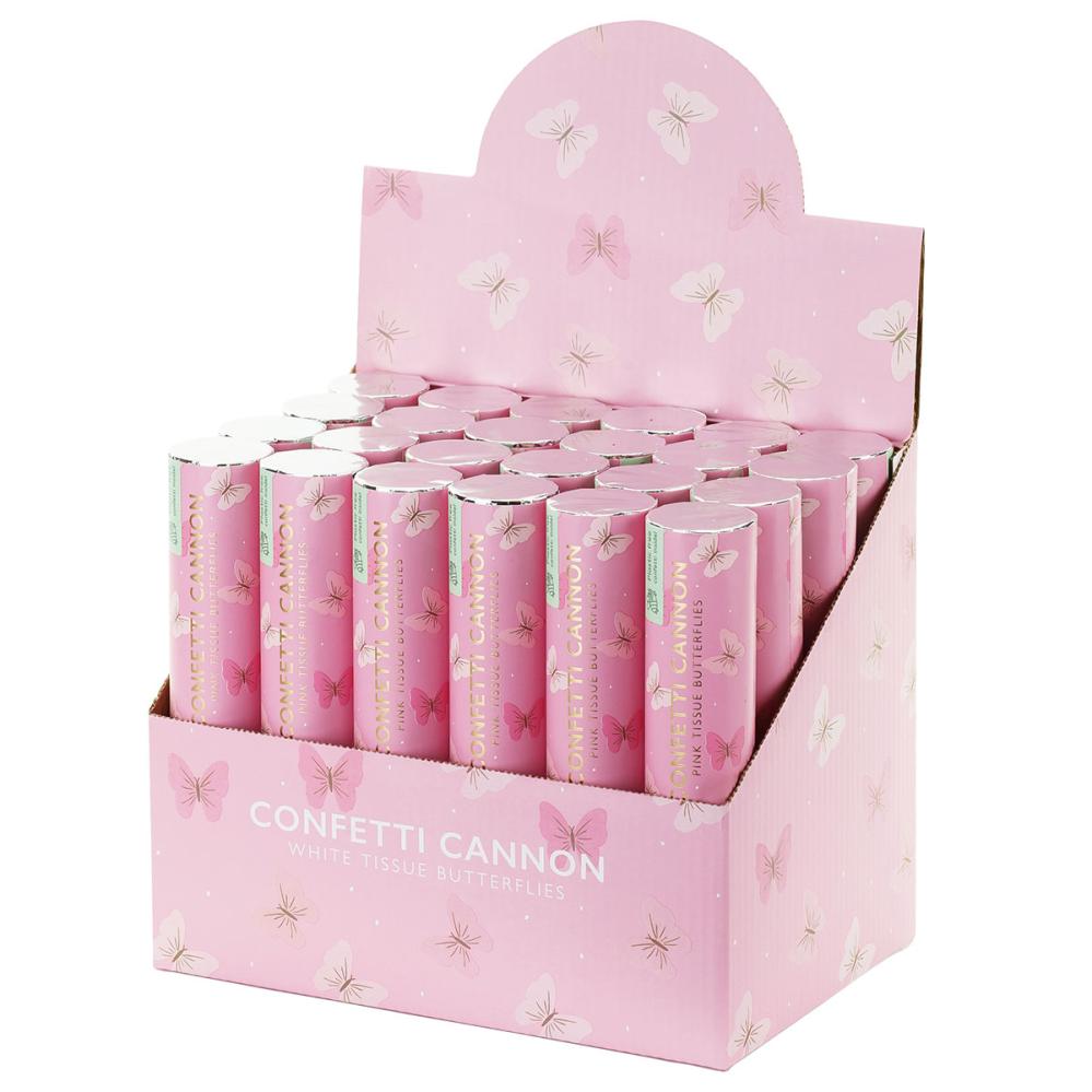 Konfettitykki Vaaleanpunaiset Perhoset 20 cm on konfettitykki, joka ampuu ulos paperikonfettia vaaleanpunaisten perhosten muodossa, kun tykin alaosaa kierretään.