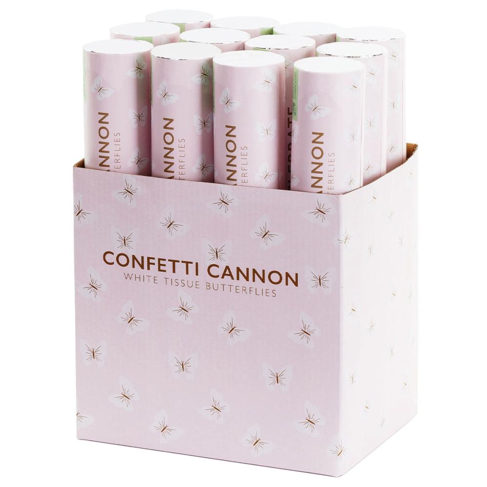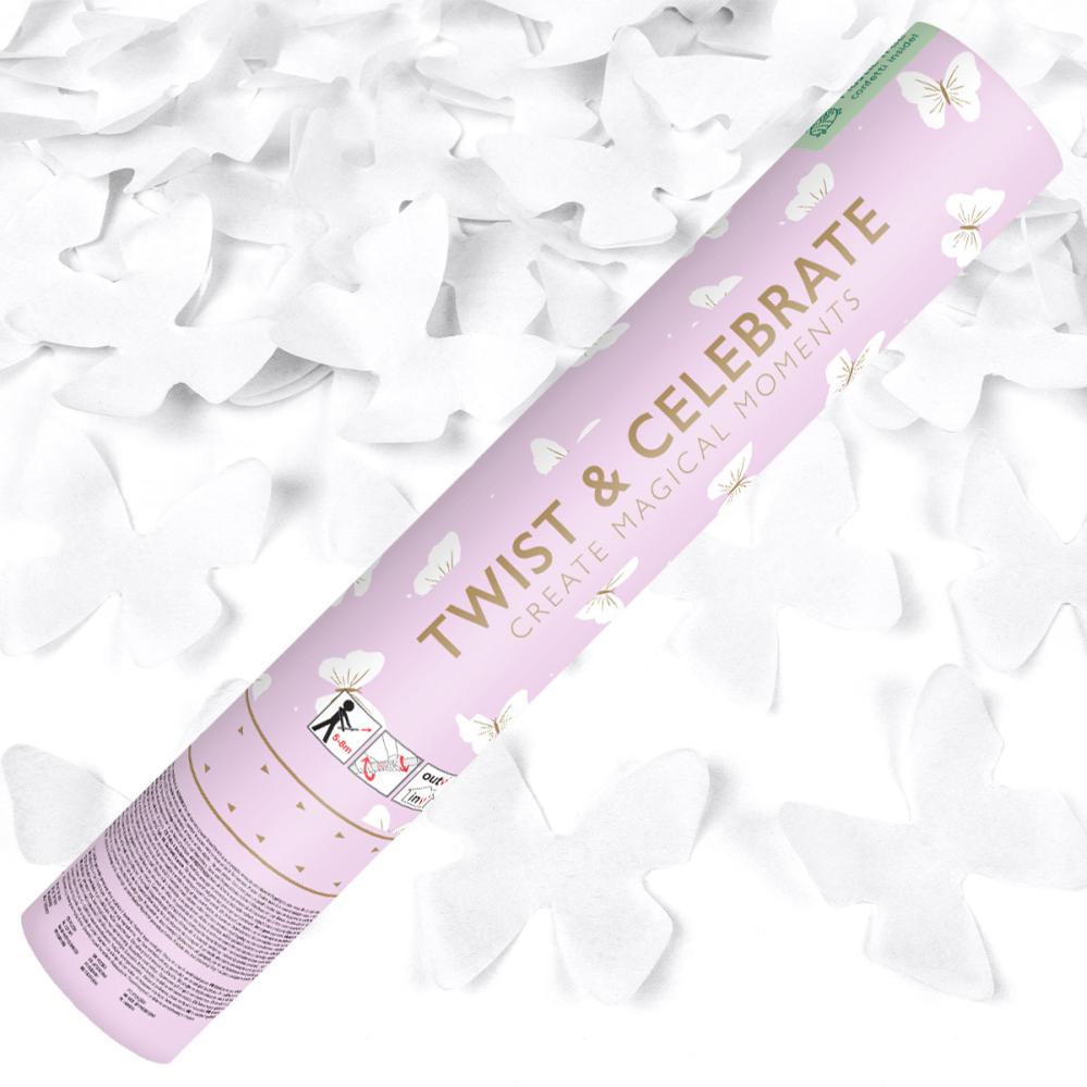 Konfettitykki Valkoiset Perhoset 28 cm sisältää konfettitykin, joka ampuu ulos valkoisten perhosten muotoista paperikonfettia, kun tykin alaosaa kierretään.