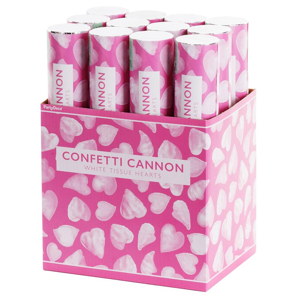 Konfettitykki Valkoiset Sydämet 28 cm sisältää konfettitykin, joka ampuu ulos paperikonfettia valkoisten sydämien muodossa, kun tykin alaosaa käännetään.