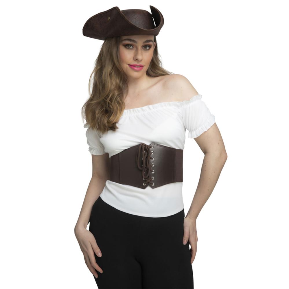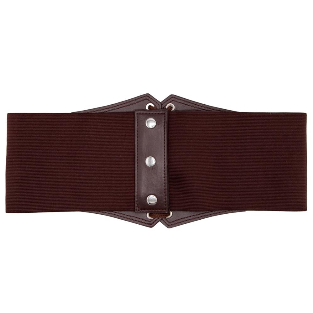 Korsettivyö Ruskea on säädettävä ruskea korsettivyö, jossa on nyöritys edessä ja kolme painonappia takana, jotka takaavat helpon kiinnityksen.