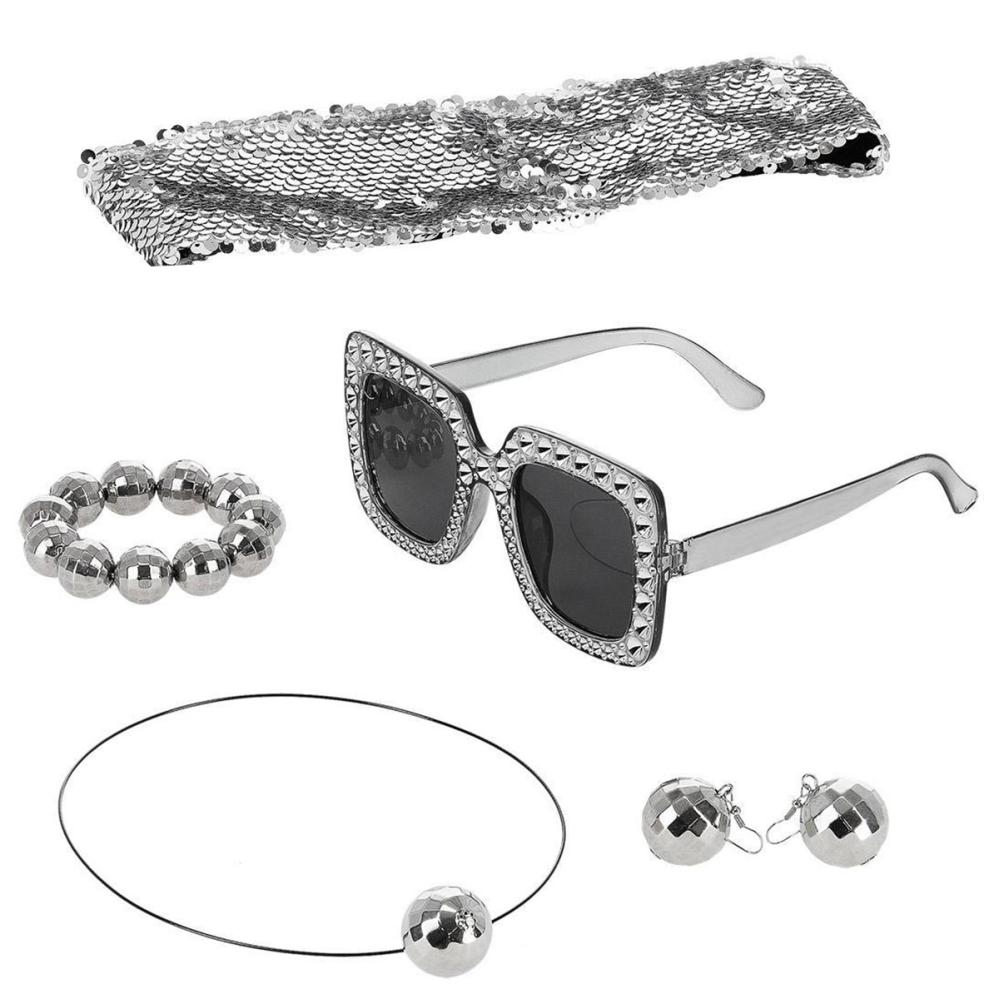 Korusetti Diskopallo 70-luvun on hopeasävyinen, 70-luvusta inspiroitunut korusetti, jossa on diskopalloaihe. Settiin sisältyy kaulakoru, rannekoru ja yhdet korvakorut, kaikki koristeltu pienillä hopeisilla diskopalloilla. Mukana tulee myös aurinkolasit, joissa on sävytetyt linssit ja jotka on koristeltu pienillä muovitimanteilla, sekä leveä panta, joka on päällystetty pienillä, kiiltävillä hopeapaljeteilla. Huomaa, että aurinkolasit eivät ole UV-suojatut!