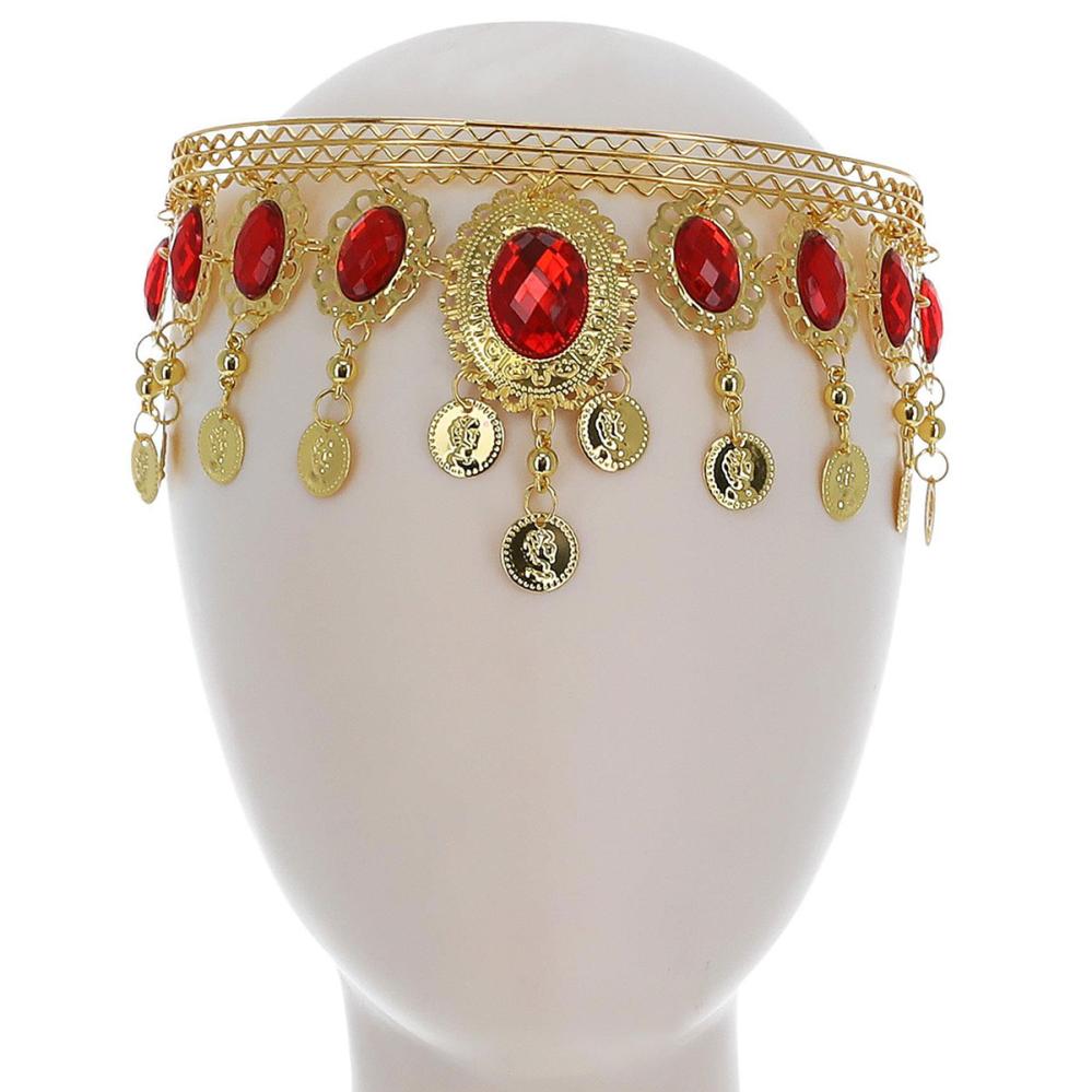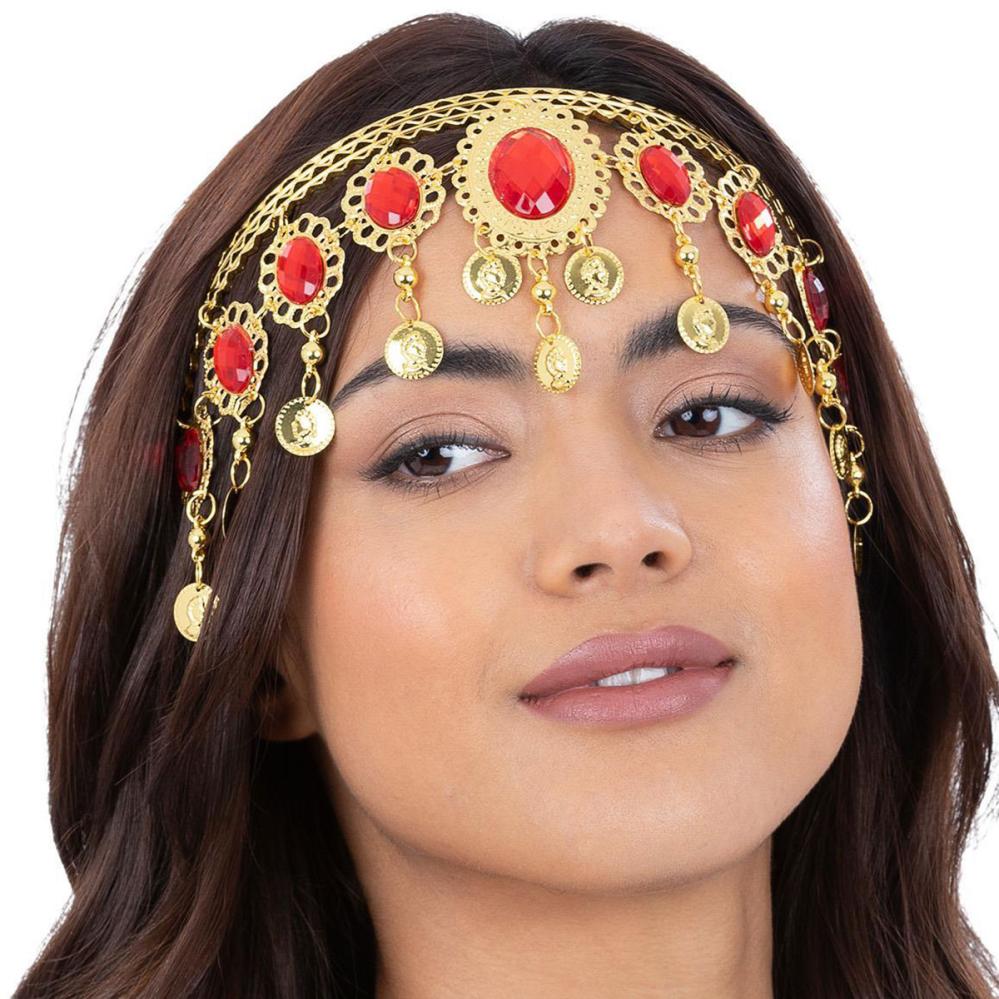 Kreikkalainen Hiuskoriste Rubiineilla käsittää kullanvärisen hiuspannan, jonka tyyli on saanut inspiraationsa antiikin Kreikasta, ja jota koristavat riippuvat punaiset rubiinit ja pienet kolikot.
