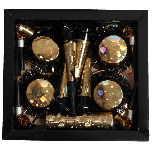 Kultainen Uudenvuoden Setti 4 Hengelle sisältää neljälle hengelle tarkoitetut juhlatarvikkeet mustana ja kultaisena, pilkut hohtavat sateenkaaren väreissä. Pakkaus sisältää neljä pientä hattua, neljä torvea, neljä serpenttiinipilliä ja serpenttiinejä.