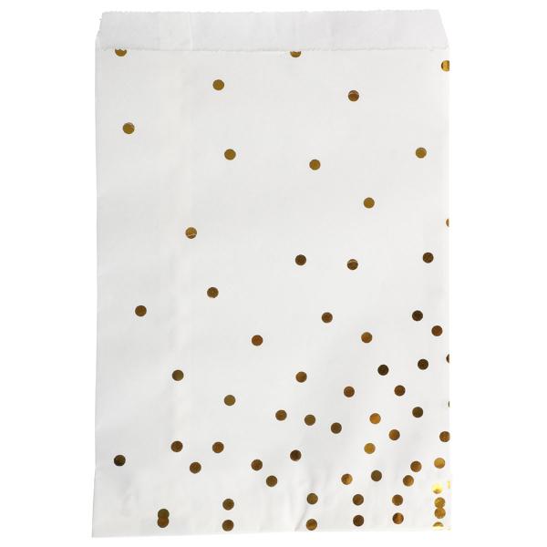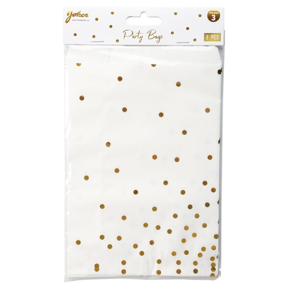 Kultapilkulliset Juhlapussit 8 kpl sisältää kahdeksan valkoista paperipussia, jotka on koristeltu pienillä, hohtavilla kultapilkuilla.