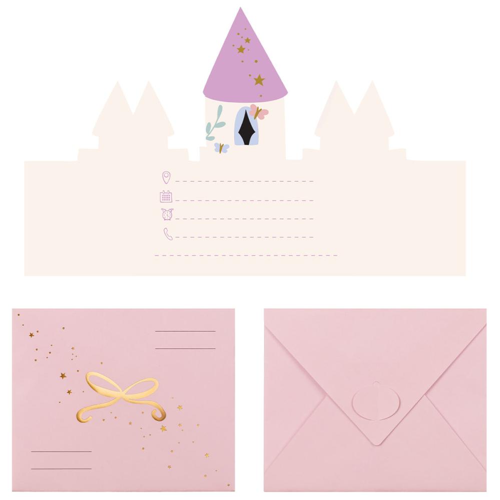 Kutsukortti Linna 6-kpl sisältää kuusi taitettavaa kutsukorttia vaaleanroosilla kirjekuorilla ja kuvituksena vaalean roosan sävyisen linnan, jota koristavat perhoset, kasvit ja kimalteleva kullanvärinen rusetti. Linnaa koristaa kolme laventeliroosaa tornia, joissa on kimaltelevia kullanvärisiä tähtiä. Jokaisessa kortissa on kentät paikalle, päivämäärälle, kellonajalle, puhelinnumerolle ja muille tiedoille.