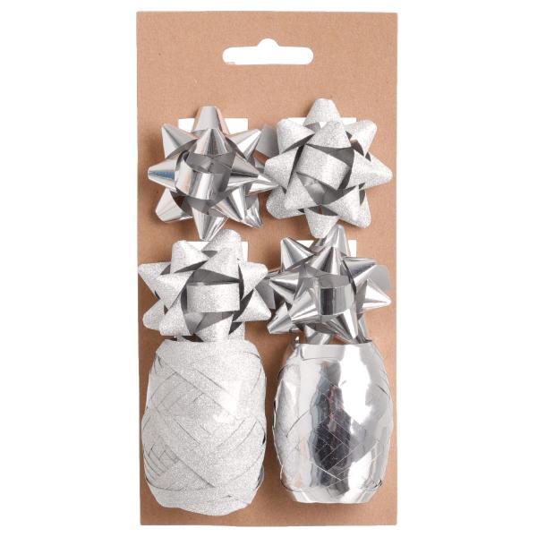 Lahjanauha ja Rusetti Setti Hopea sisältää hopeansävyisen lahjapaketointisetin, jossa on kimalteleva lahjanauha, glitterillä koristeltu lahjanauha, kaksi kimaltelevaa lahjarusettia ja kaksi glitterillä koristeltua lahjarusettia.