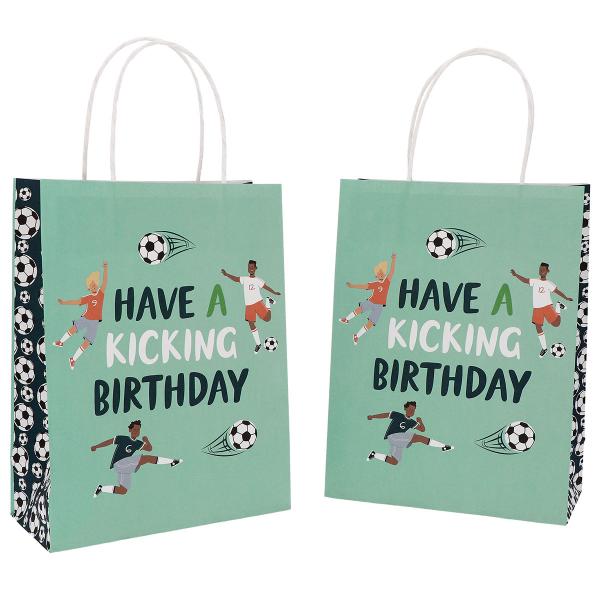 Lahjapussit Jalkapallojuhlat 6 kpl sisältää kuusi turkoosia lahjapussia kantokahvoilla, ja molemmilla puolilla on kuvitus jalkapalloilijoista sekä teksti "Have A Kicking Birthday". Lyhyet sivut ja pohja ovat tummansinistä sävyä, ja sivuilla on myös jalkapallokuvioita.