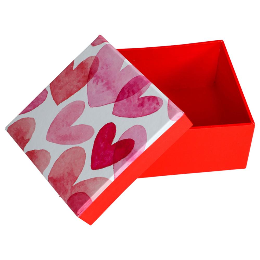 Lahjarasia Sydämet 10x10x5 cm on punainen ja valkoinen lahjarasia, jota koristavat punaiset ja vaaleanpunaiset sydämet.