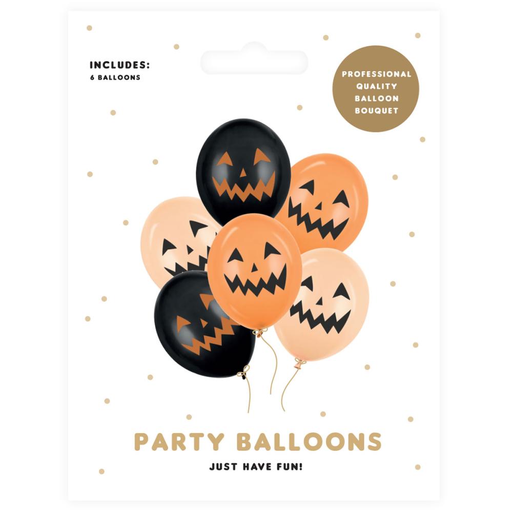 Lateksiilmapallot Kurpitsat Sekalaiset Värit sisältää sekoituksen halloween-kurpitsakuvioituja lateksiilmapalloja, väreissä musta, oranssi ja aprikoosi.