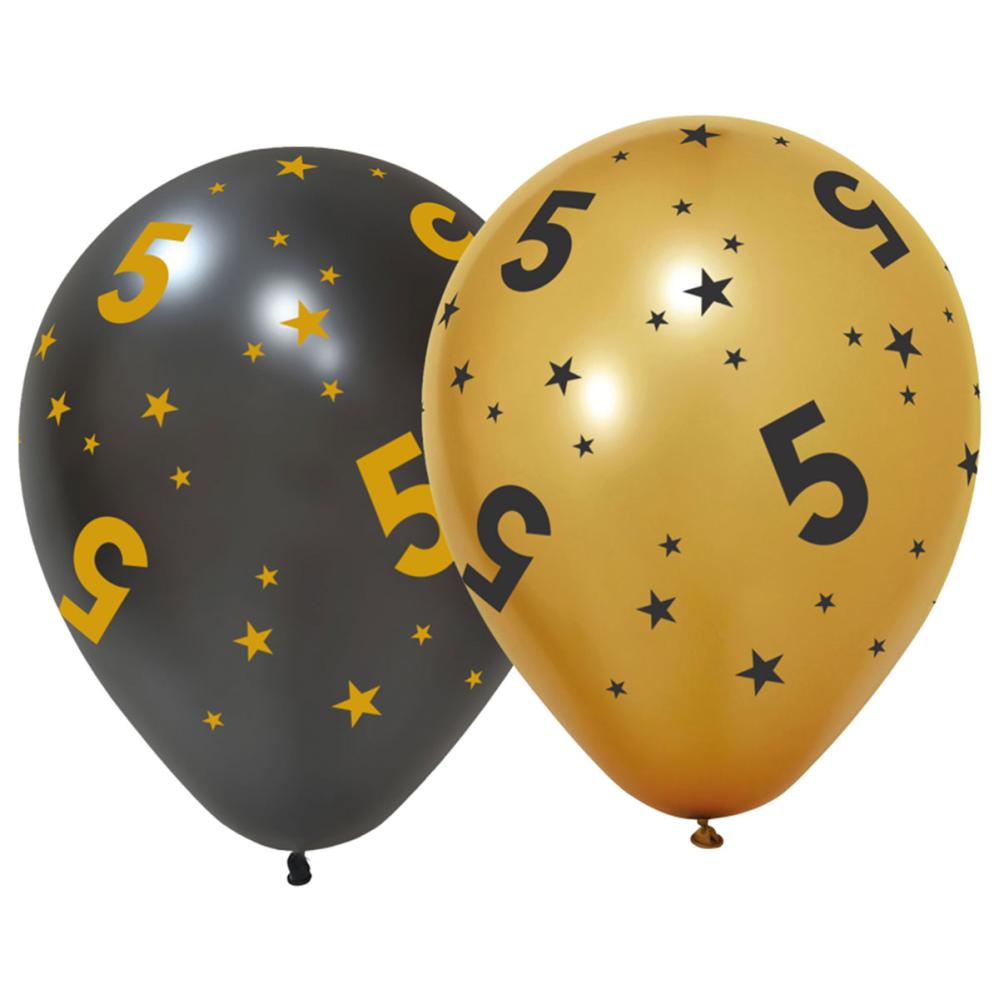 Lateksiilmapallot Tähdillä ja Numerolla 5, 6 kpl sisältää kuusi lateksi-ilmapalloa, joista kolmessa on tähtiä ja numero "5" mustana kullanvärisellä taustalla ja muissa kolmessa sama kuvio päinvastaisissa väreissä.