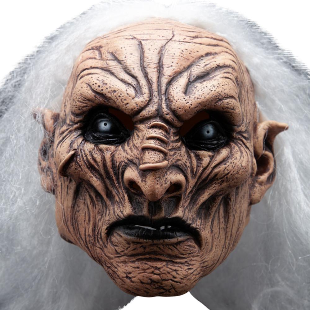 Lateksinen Demoninaamio Hiuksilla on beige, demoniaiheinen lateksinaamio, jossa on mustia yksityiskohtia ja valkoiset hiukset, ja se pysyy paikoillaan mustalla elastisella nauhalla.