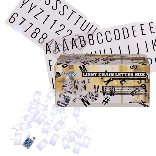 LED-valosarja kirjaimilla koostuu valosarjasta, jossa on 20 LED-valolaatikkoa, joissa on lämmin valkoinen valaistus. Sisältää myös yhteensä 70 kirjainta (AZ), numeroita (0-9) ja valolaatikoihin kiinnitettävän &-symbolin.