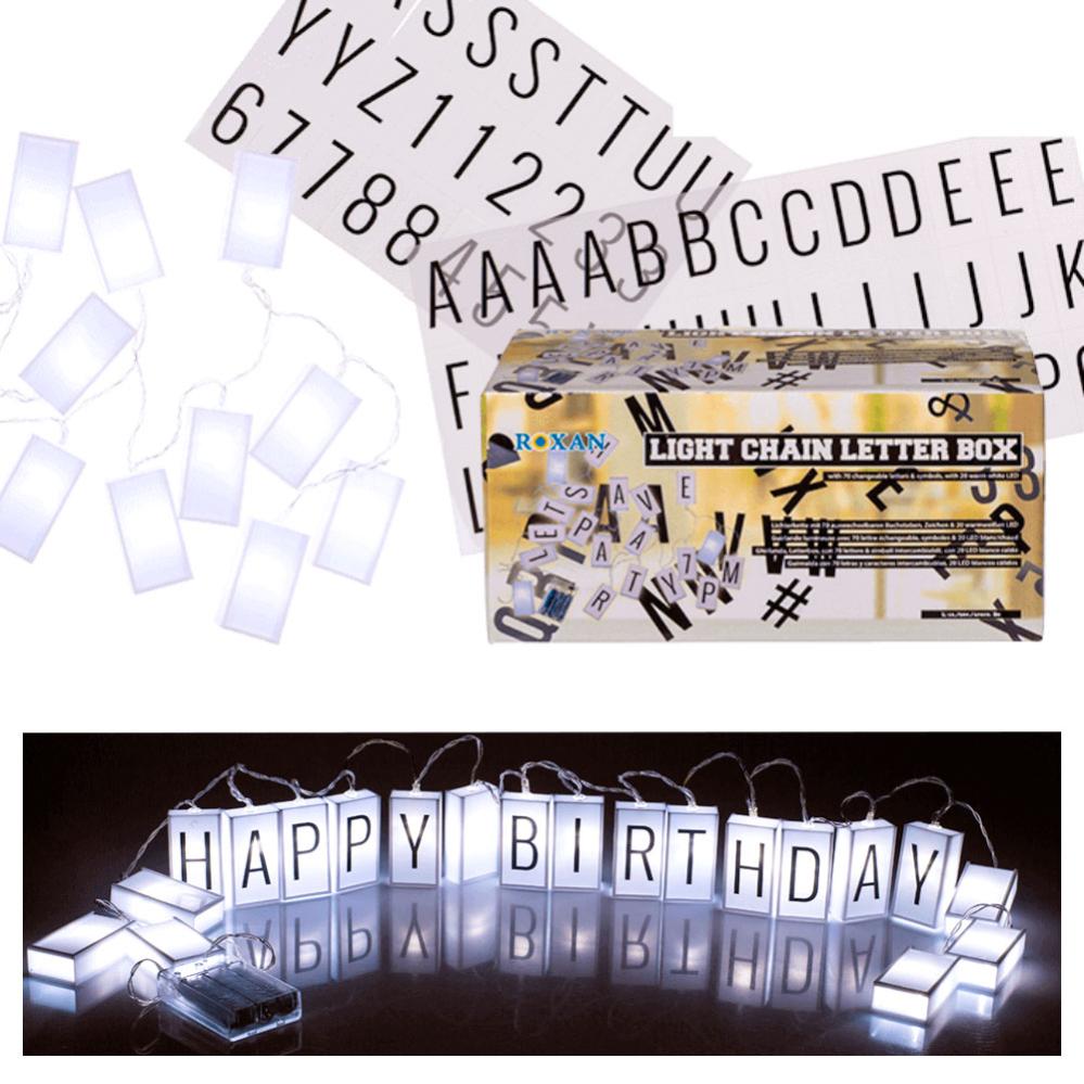 Juhlalliset kirjaimilla varustetut LED-valot, joilla voit helposti luoda oman tekstisi! Voit esimerkiksi kirjoittaa sinulle sopivan mukavan tervehdyksen, ihanan onnittelun tai tunnelmaa kohottavan tekstin. Todella hieno valosarja, joka sopii yhtä hyvin makuuhuoneeseen kuin syntymäpäiväjuhliin.