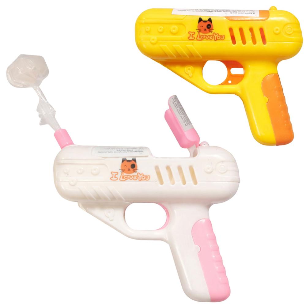 Leikkipyssy Tikkarilla sisältää leikkipyssyn, joka ampuu tikkarin ulos, kun sitä käytetään. Se on koristeltu kissanpäällä ja tekstillä "I Love You" molemmilla puolilla. Saatavana väreissä valkoinen vaaleanpunaisilla yksityiskohdilla ja keltainen oransseilla yksityiskohdilla – saamasi väri on hauska yllätys.