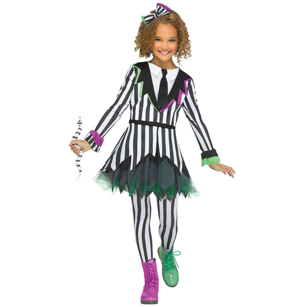 Astu Beetlejuice-teemaiseen juhlaan tässä ainutlaatuisessa lasten asussa ja vangitse kaikkien katseet. Tämä asu on täydellinen Beetlejuice-naamiaisiin, siinä on raidallisia yksityiskohtia, värikkäitä korostuksia ja karmivaa viehätysvoimaa.