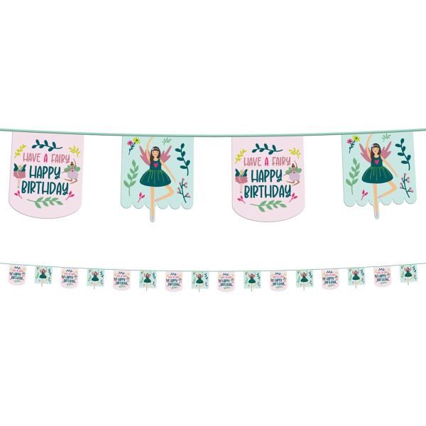 Lippuviirinauha Fabulous Fairy 6 m sisältää viirinauhan, jossa on yhteensä 16 lippua ja kaksi erilaista keijukuviointia. Yhdessä lipussa on tanssiva keiju kukkien kanssa salvianvihreällä taustalla, kun taas toisessa on teksti "Have A Fairy Happy Birthday" ja sitä koristavat keijut ja kukat vaaleanpunaisella taustalla. Liput on kiinnitetty salvianvihreään polyesterinauhaan. Viirinauhan pituus on 6 metriä ja se jättää noin 1 metriä molemmille sivuille helppoa ripustamista varten.
