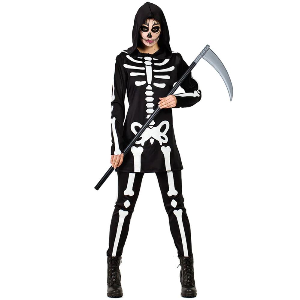 Luurankoasu Hupulla sisältää pitkän huppupaidan, jossa on pitkät hihat, sekä mustavalkoiset housut.
