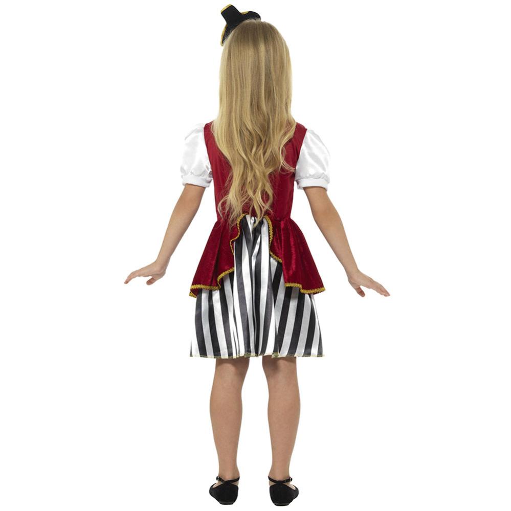 Merirosvomekko Naamiaisasu Lapsille sisältää mekon, jossa on valkoinen yläosa ja kiinniommeltu punainen liivi röyhelöillä, musta vyö sekä musta-valkoraidallinen hame. Mekossa on kullanvärisiä yksityiskohtia ja mukana tulee myös diadeemi, jossa on pieni merirosvohattu.