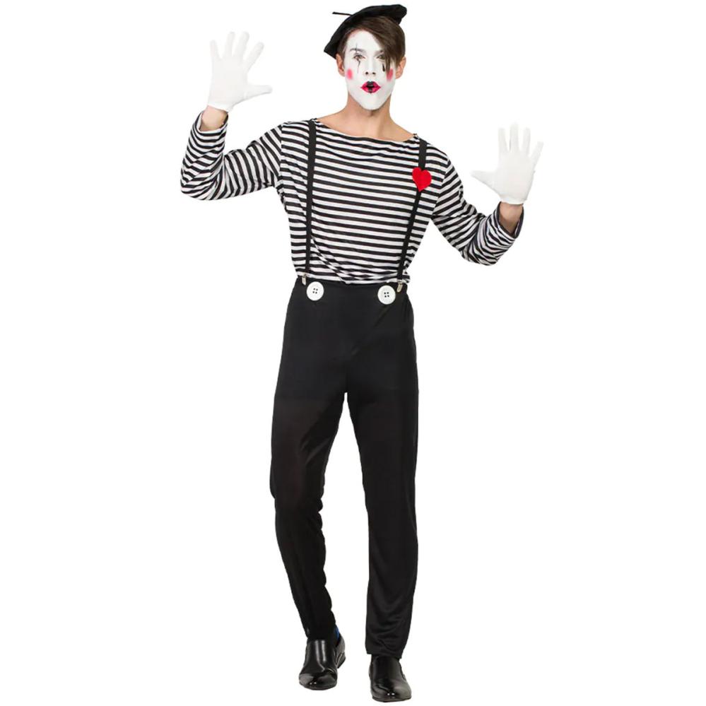 Miimikko Naamiaisasu sisältää mustan naamiaisasun, jossa on miimikon teema, sekä baretin, mustavalkoraidallisen paidan, mustat henkselit, punaisen sydämen muotoisen merkin, yhdet valkoiset hanskat ja yhdet mustat housut.