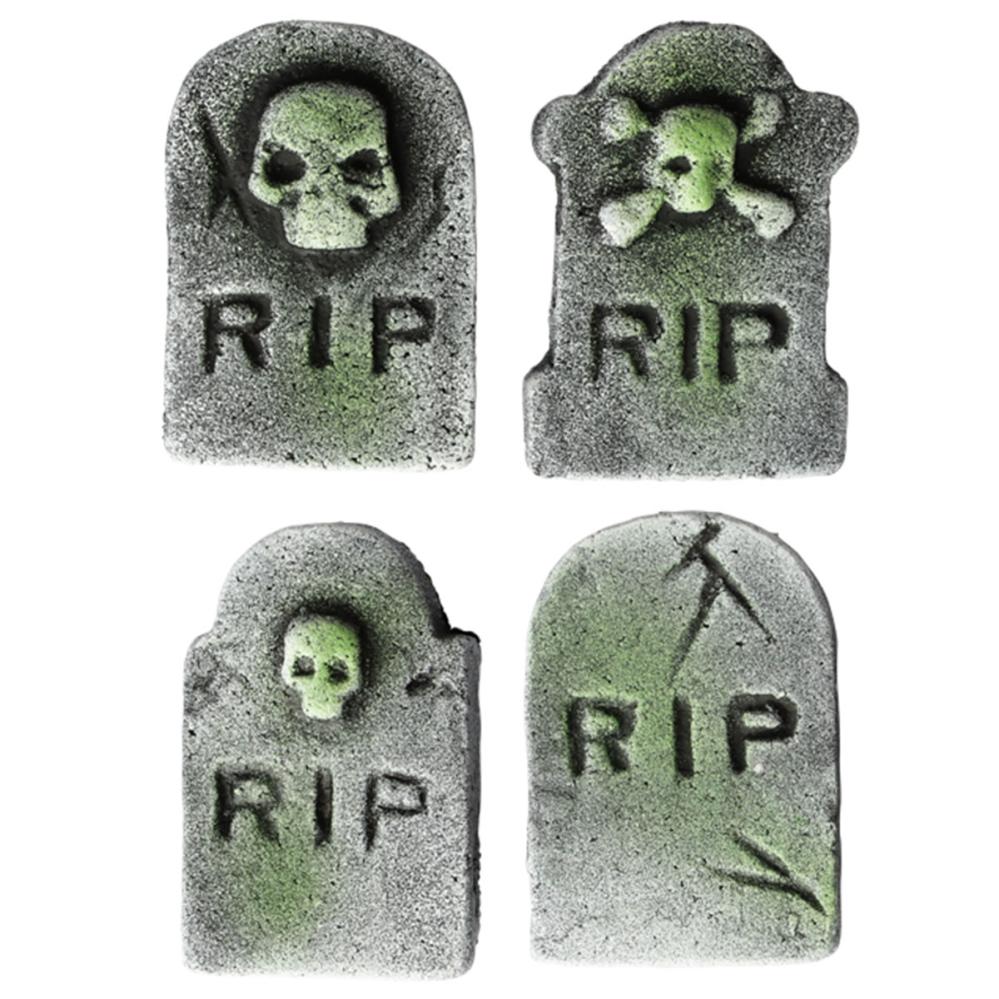 Mini Hautakivet Halloween-koristeet 4 kpl sisältää setin neljästä pienestä hautakivikoristeesta, joista jokaisessa on ainutlaatuinen kuvio, sään pieksemä ulkonäkö ja vihreitä yksityiskohtia sekä teksti 'R I P' etupuolella. Jokaisessa hautakivessä on pieni reikä pohjassa, jotta sen voi helposti kiinnittää esimerkiksi kukkakepillä. Ne sopivat erinomaisesti käytettäväksi sekä sisällä että ulkona suojaisissa paikoissa.