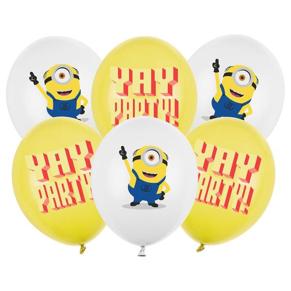 Minions Lateksi-ilmapallot Mix 30 cm 6 kpl koostuu kuudesta ilmapallosta kahdessa eri vaihtoehdossa: valkoisista ilmapalloista, joissa on Minions-hahmo Mel, sekä keltaisista ilmapalloista, joissa on teksti "YAY PARTY!" keltaisella ja punaisella.