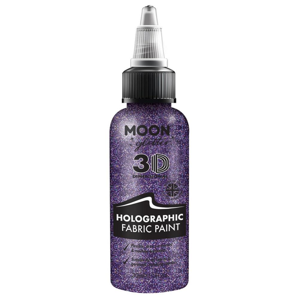 Moon Glitter Holografinen Glitter Tekstiiliväri 30 ml koostuu holografisesta glittertekstiiliväripullosta, jossa on pysyvä väri. Maalaa kangas ja anna sen kuivua 24 tuntia. Käytä saippuaa ja lämmintä vettä poistaaksesi märän värin. Kuivumisen jälkeen pinta on vedenpitävä, mutta vaatteen voi pestä 72 tunnin kuluttua.